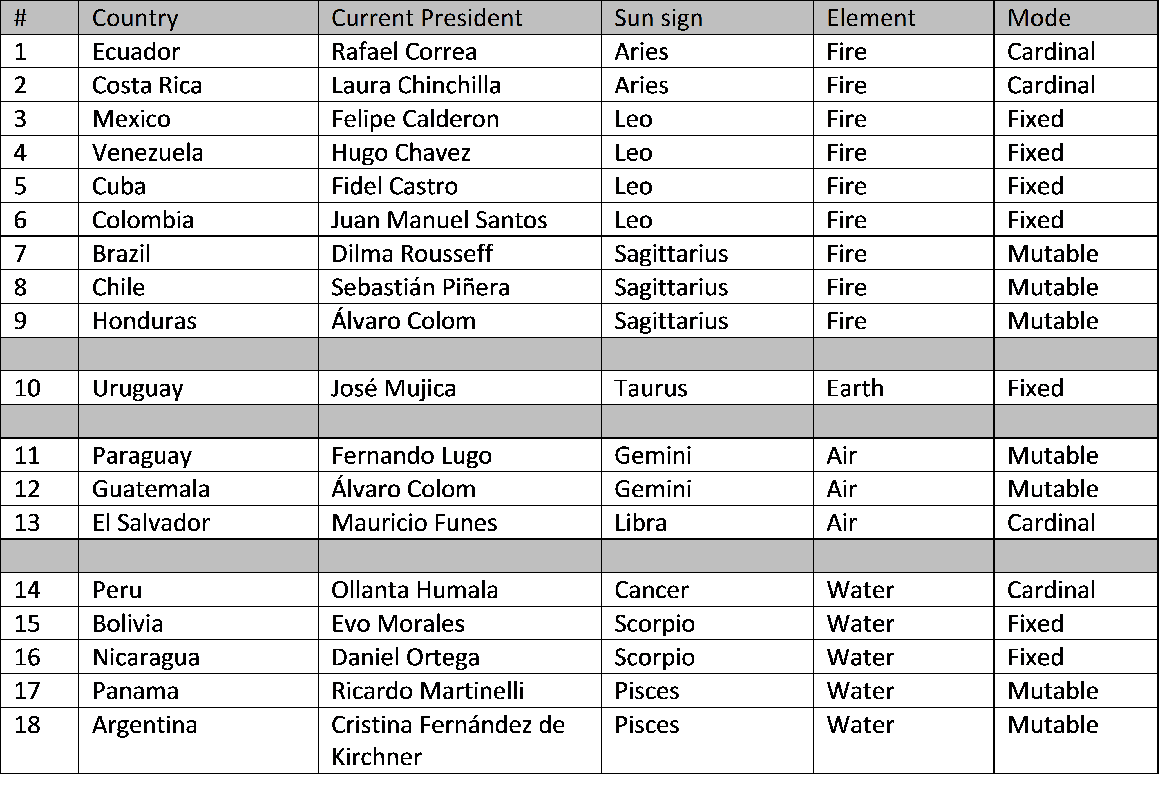 Like the United States, Latin/South America likes fixed signs (Leo, Aquarius, Taurus and Scorpio). Almost half of the current Latin/South American rulers are fixed.