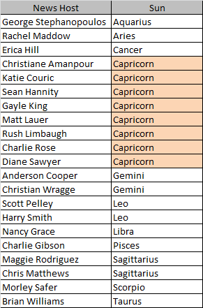While there are too many news show hosts to study on this sunny morning, I did notice in the chart above that the Capricorns are older and the newer news show hosts are from non-Capricorn signs.