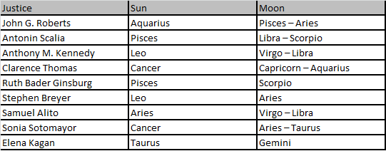 The only air sign is Aquarius Roberts and the only earth sign is Taurus Kagan. I don’t follow Supreme Court decisions much, but I’m guessing these two might be the most detached and able to make decisions that do not please others.
