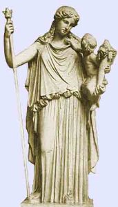 Eirene is the Goddess of Peace. She is seen in this statute holding Pluto in her arms (picture from journeyingtothegoddess.wordpress.com).